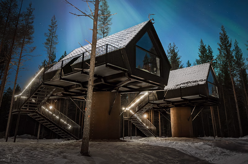 Enjoy a luxurious nature getaway in one of our Aurora Treehouses, a cosy cottage perched on a 3-metre pillar among Arctic evergreens. The panoramic window commands a magnificent view of the lake and gives you a front row seat to the spectacular winter display of Northern Lights! The fine interior combines the charm of the countryside with the modern flair of Finnish design. The pine panelling and warm king-size bed alone will give you a sense of great comfort. The only downside: you'll find it hard to leave!