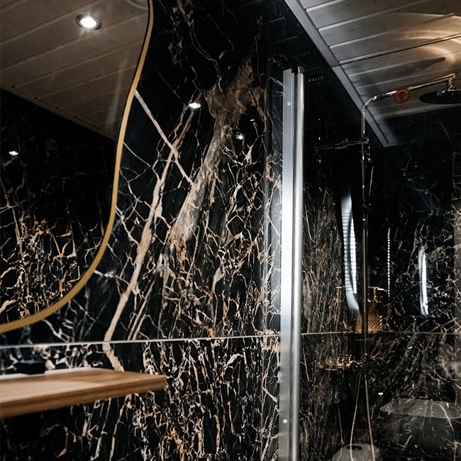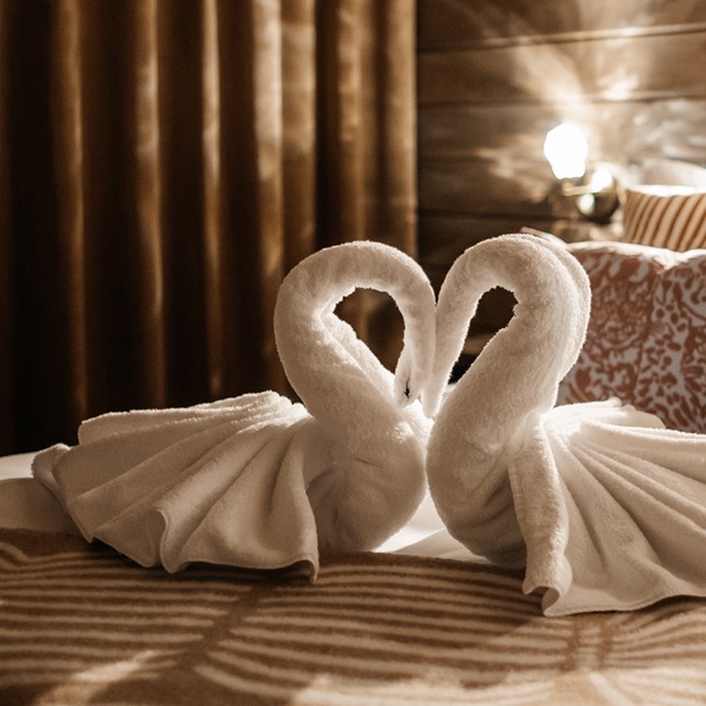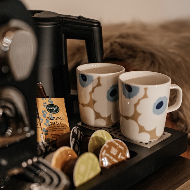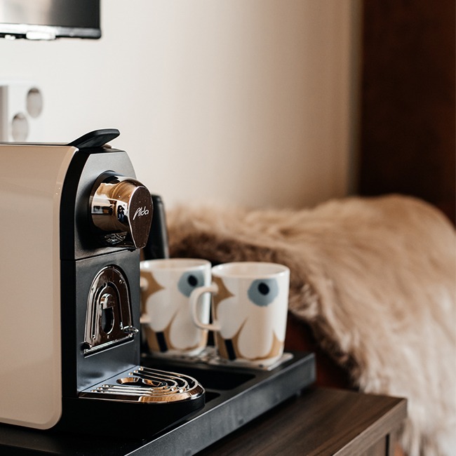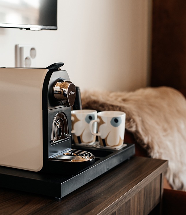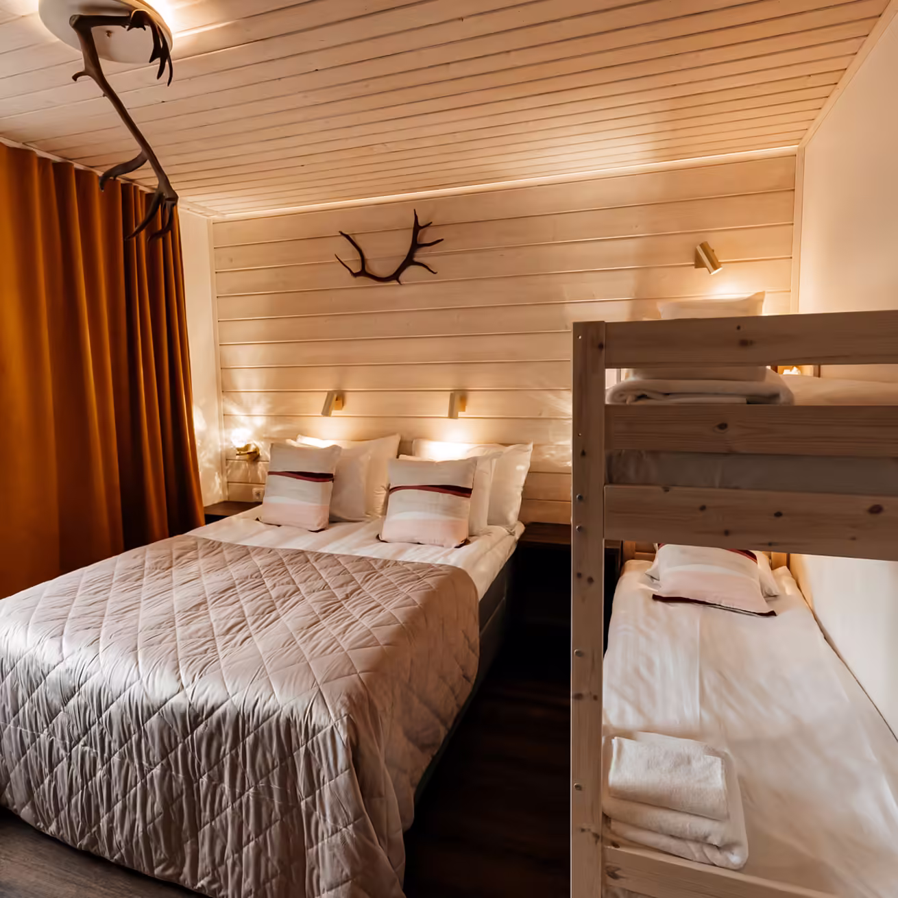 Our Deluxe Rooms truly capture the serenity of the Arctic with their rustic yet luxurious feel. A large wood paneling runs from the ceiling to the main wall and surrounds a gracefully draped bed. The bathroom design inspires restfulness and gives you a taste of the wellness experience that awaits you in the spa centre. Take a deep breath as you gaze through the window and scan the edge of a vast forest or a boundless sky stretching across a picturesque lake.